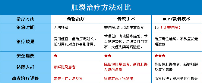目前治疗肛裂的手术中,效果较好的要数HCPT术,该手术已经逐渐取代传统手术,治疗肛裂,通过手术进行操作,不仅手术过程放心可靠、方便快捷,而且手术中疼痛轻微、不出血,术后也不会留下不良的影响,因而深受广大患者青睐。